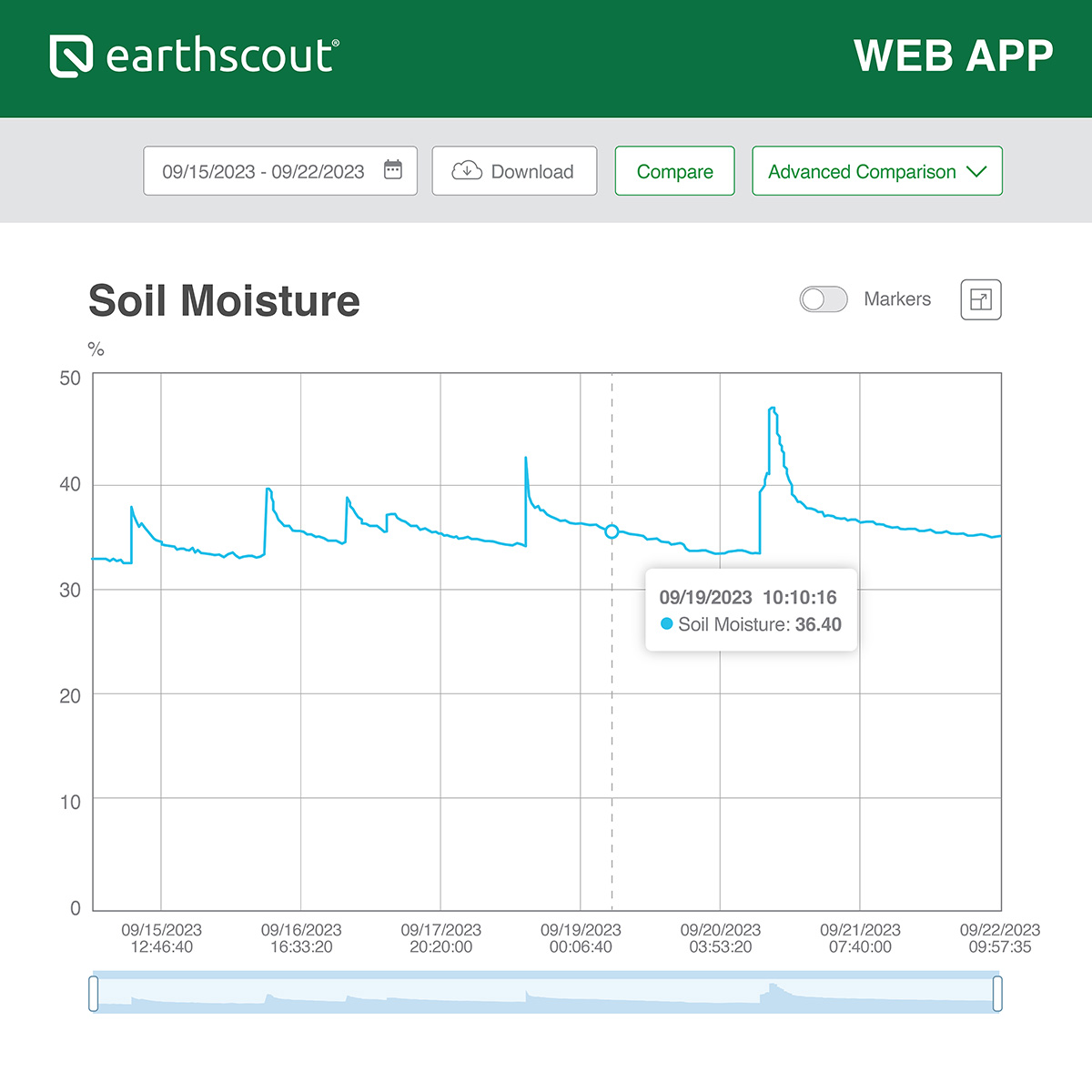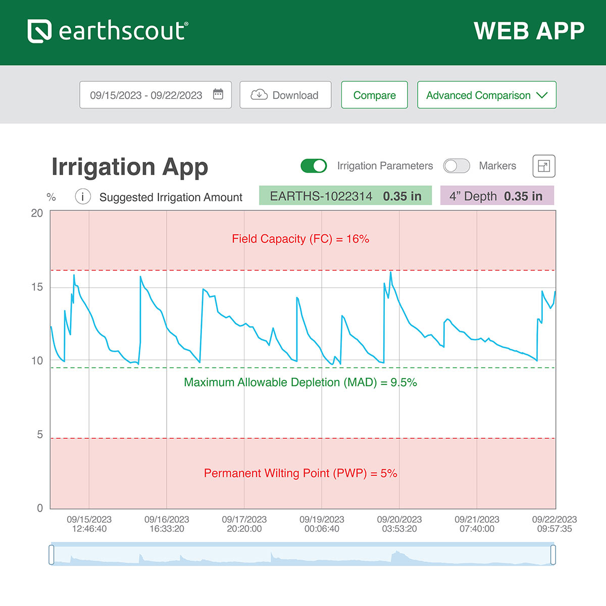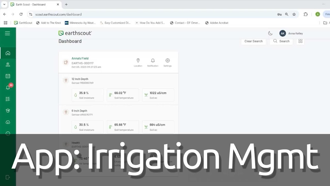 Description: In this video, we show how growers can use the EarthScout Irrigation App to set up simple guidelines to ensure their soil moisture remains in the optimal range for plant growth. In the EarthScout Irrigation App, growers can set their Field Capacity (FC), Maximum Allowable Depletion (MAD), and Permanent Wilting Point (PWP). Then, growers can monitor their soil moisture levels in the app and adjust their irrigation to maintain the optimal moisture levels between Field Capacity and MAD. We can help you get set up in minutes… Just give us a call.