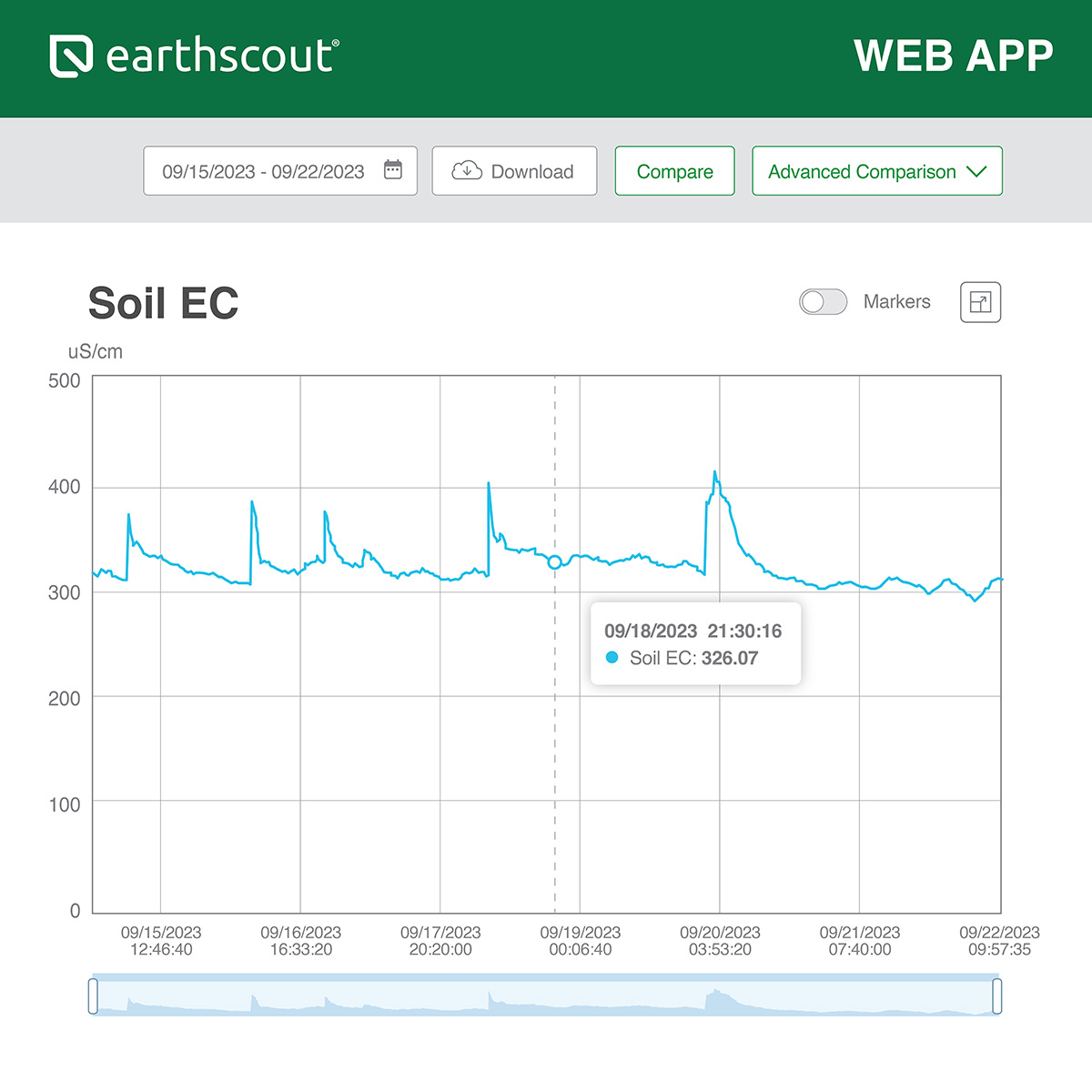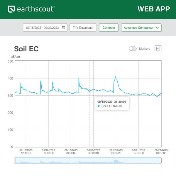 - Monitors soil moisture, soil temperature, and soil electroconductivity (EC)