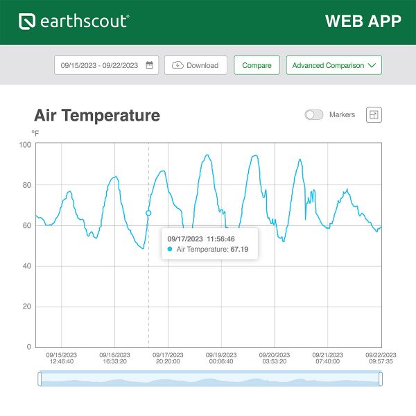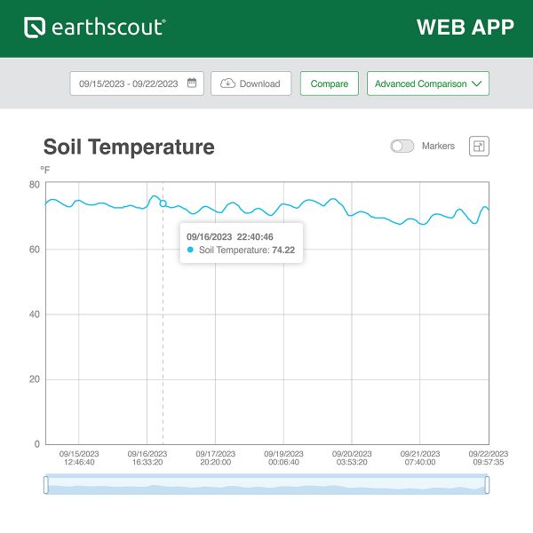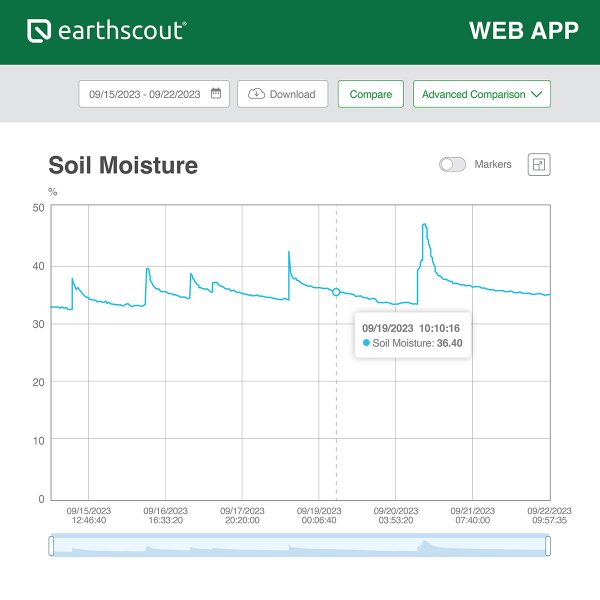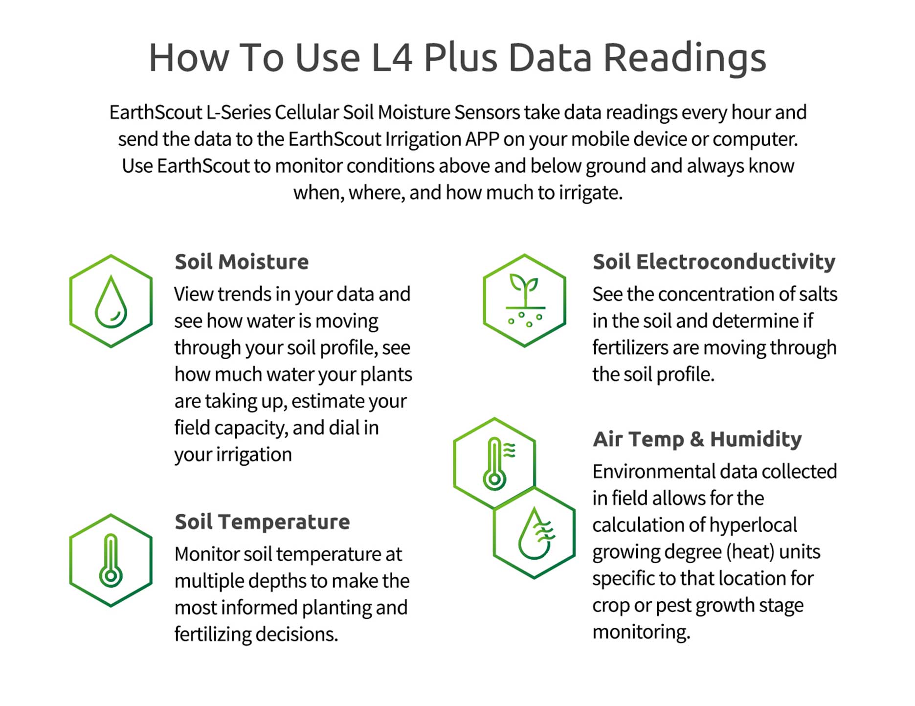 How To Use L4 Plus Data Readings: EarthScout L-Series Cellular Soil Moisture Sensors take data readings every hour and send the data to the EarthScout Irrigation App on your mobile device or computer. Use EarthScout to monitor conditions above and below ground and always know when, were, and how much to irrigate. Soil Moisture: View trends in your data and see how water is moving through your soil profile, see how much water your plants are taking up, estimate your field capacity, and dial in your irrigation. Soil Temperature: Monitor soil temperature at multiple depths to make the most informed planting and fertilizing decisions. Soil Electroconductivity (EC): See the concentration of salts in the soil and determine if fertilizers are moving through the soil profile. Air Temperature & Humidity: Environmental data collected in field allows for the calculation of hyperlocal growing degree (heat) units specific to that location for crop or pest growth stage monitoring.
