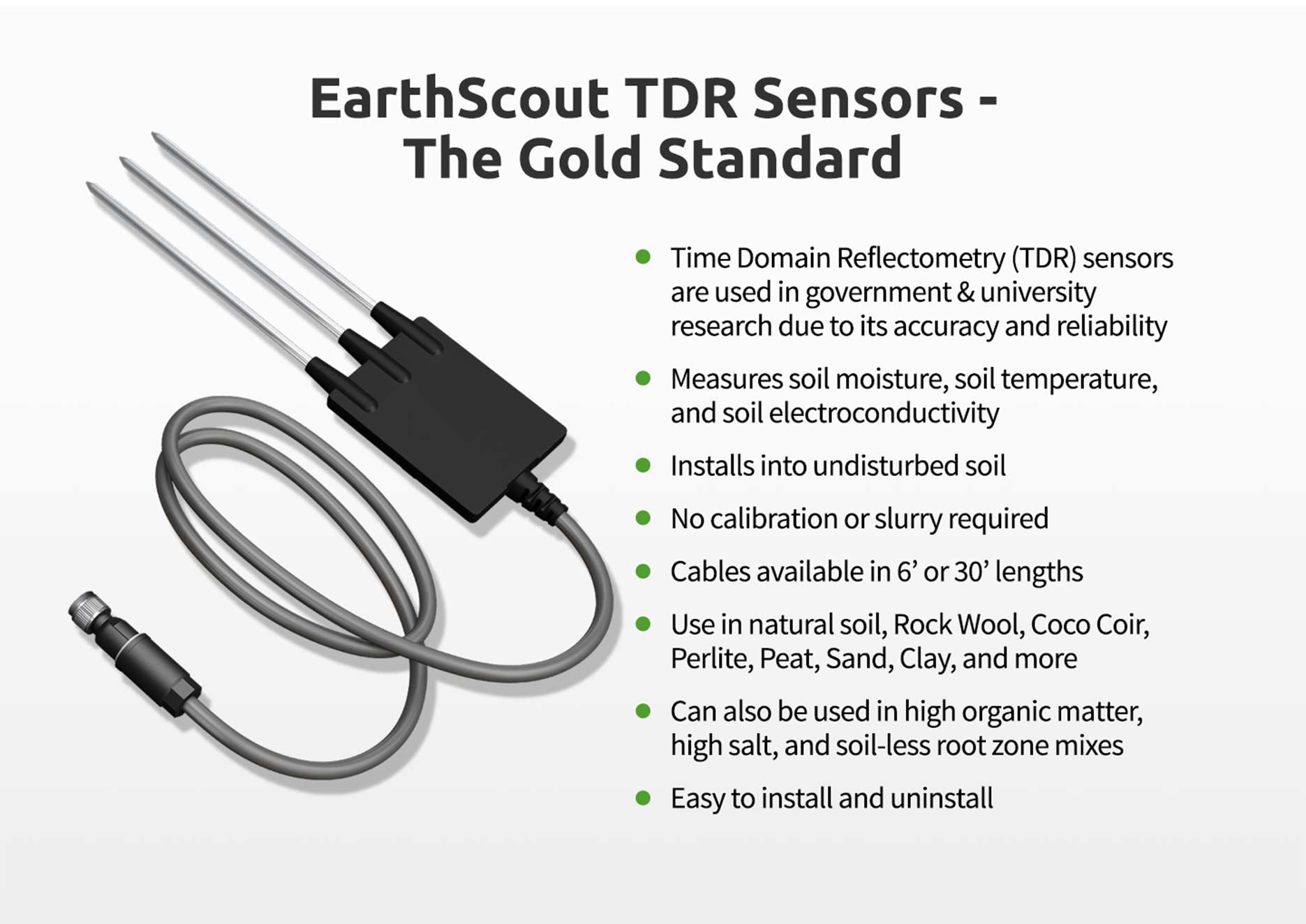 - FLEXIBLE DATA COLLECTION: Place TDR sensors at the soil depths you choose. Cables available in 6’ or 30’ lengths for specialty growing, research, or education
