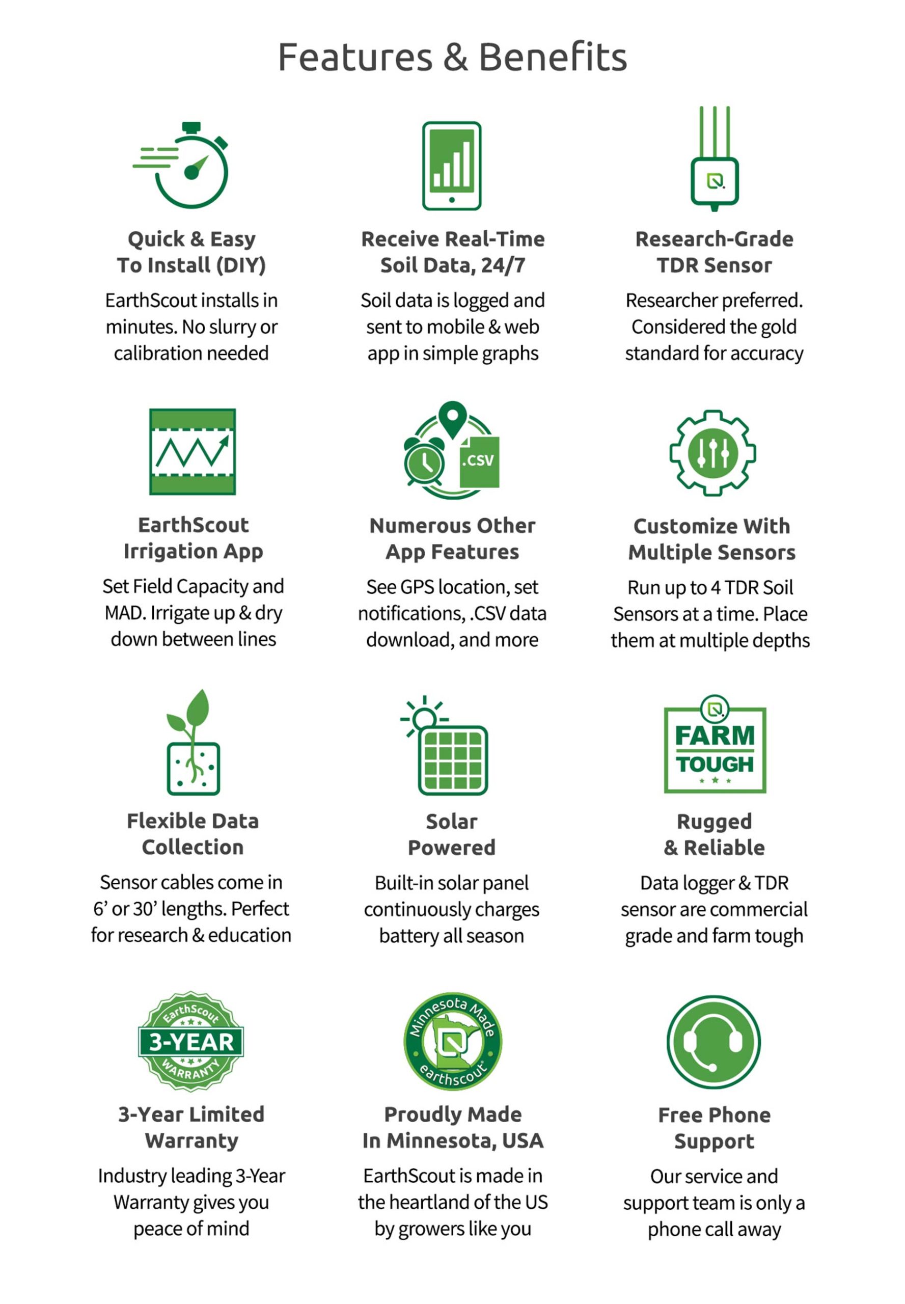EarthScout L4 Plus Cellular Soil Moisture Sensor installs in minutes and no slurry or calibration is needed. Receive real-time soil data, 24/7. Soil Data is logged and sent to mobile and web app in simple graphs. Research-grade TDR sensor is preferred by researchers, and considered the gold standard for precision and accuracy. EarthScout Irrigation App is loaded with great features: Set Field Capacity (FC) and Maximum Allowable Depletion in the app, and then simply irrigate up to FC and dry down to MAD. Numerous other app features include GPS location, set notifications, download your historic field data in a .CSV file, and more. Customize your L4 Plus with up to 4 TDR Soil Moisture Sensors at a time, and place them at multiple depths to monitor how water is passing through the soil. Sensor cable are available in 6′ or 30′ lengths. Perfect for specialty growing situations, or for research & education. A built in solar panel continuously charges the battery all season long. EarthScout products are rugged & reliable, commercial grade, and farm tough. EarthScout products are proudly built in Minnesota, USA, by growers like you. EarthScout includes a 3-Year Warranty, and we provide our customers free phone support.