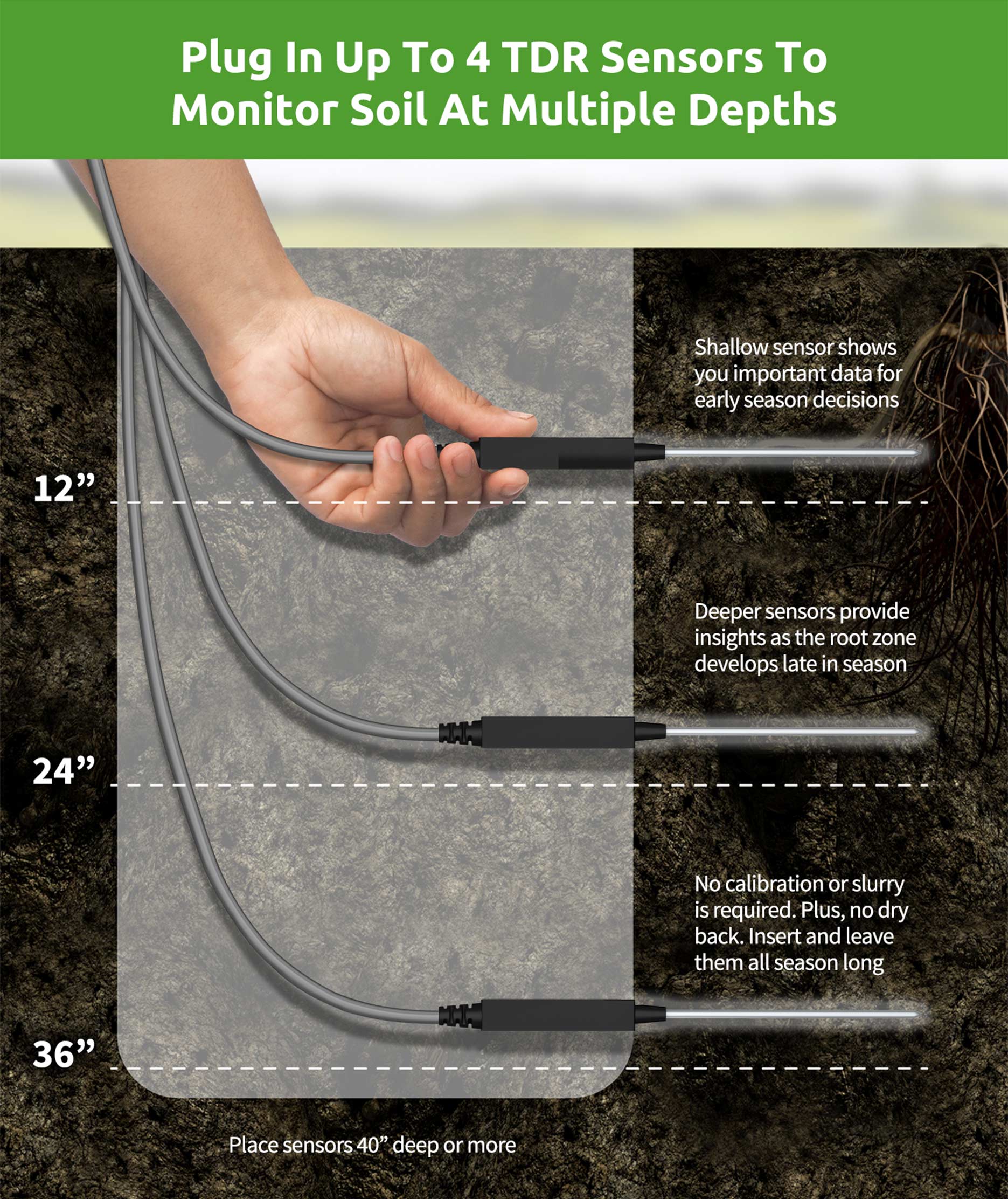 Plug In Up To 4 TDR Sensors To Monitor Soil At Multiple Depths. Dig a hole using a shovel or our Soil Auger Drill Bit and insert your TDR Sensors into the sidewall of a hole at any depth. Insert a shallow TDR sensor to receive important data on the EarthScout Irrigation App for early season decisions. Deeper sensors provide valuable insights as the roots move deeper in the soil later in the season. EarthScout TDR sensors install in undisturbed soil, and no calibration or slurry is required. Plus, with TDR sensors there is no risk of bad data or reinstallation due to soil dry back. Just insert the TDR sensor into the side of the hole at the depths you choose, fill in the hole with dirt, and leave the sensor in place all season long. Use an EarthScout Burial Tube for making sensor insertion quick and easy.
