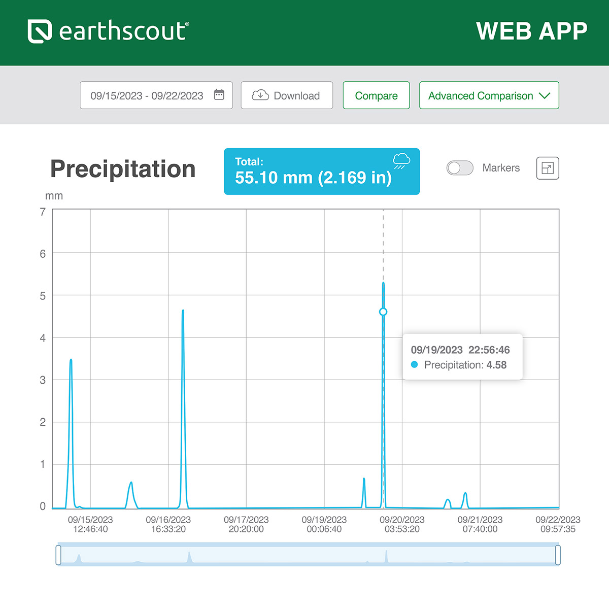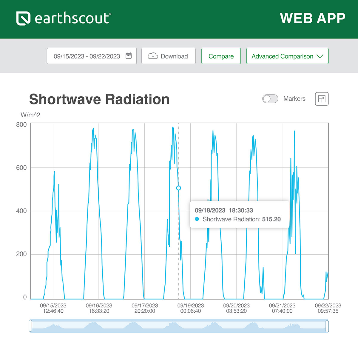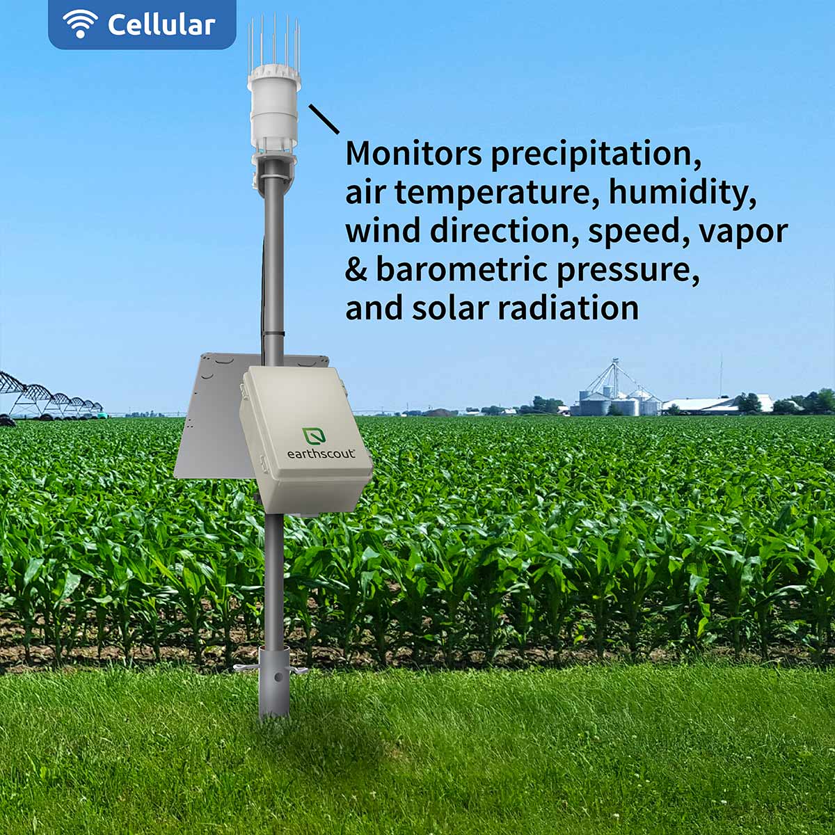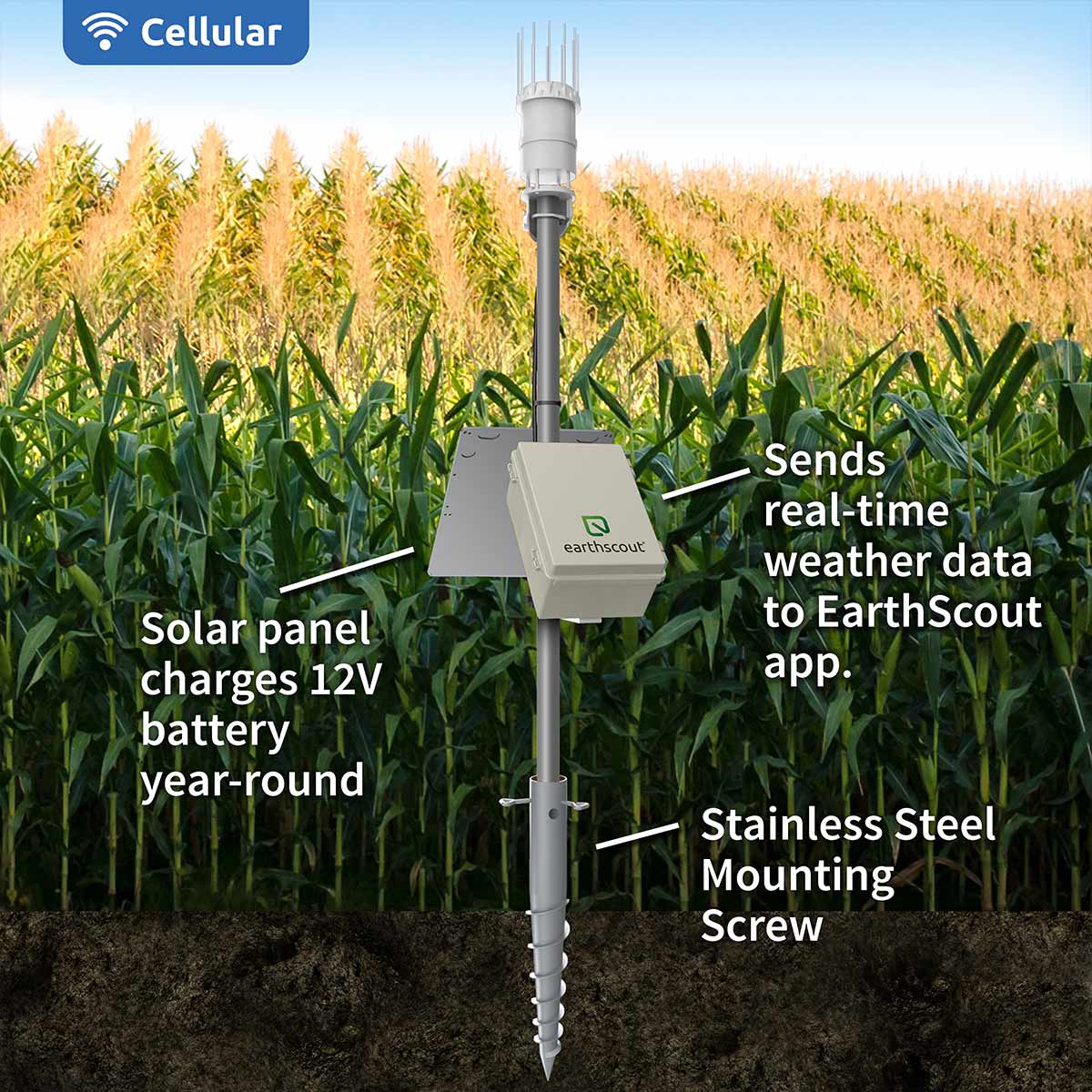 Monitor the precipitation, wind speed, wind direction, air temperature, humidity and 6 other weather variables in any field, anywhere, anytime. Easy to install, WeatherCub 1 Cellular uses IOT smart farming technology to send hourly weather data to the EarthScout app on your phone or laptop. WeatherCub 1 Cellular is commercial grade, has no moving parts and requires no maintenance. Includes a tilt sensor to ensure the weather station remains plumb. Designed for continuous deployment in harsh climates with extreme cold and heat, a redundant battery and solar panel ensures reliable service year-round, regardless of climate. Includes 6ft. pole with weather sensor array, solar panel, 12V battery with enclosure and mounting bracket, GPS, and ground screw. Includes 5 Years of No Cellular Fees, then only $24.99/month.